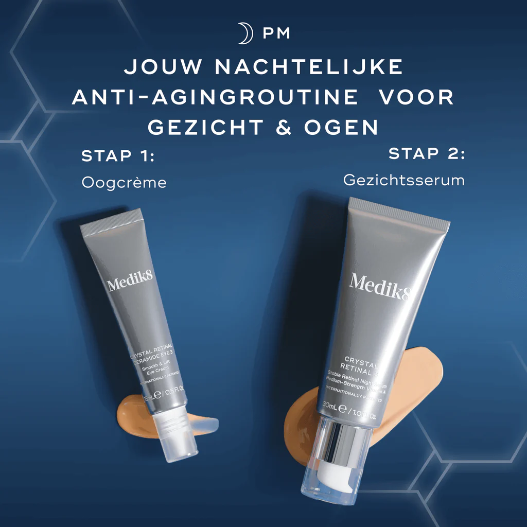 De Retinal Rewind Set is een krachtige anti-aging verzorging van Medik8, ontwikkeld om de huid ’s nachts zichtbaar te verjongen. De set bevat Crystal Retinal 3 voor het gezicht en Crystal Retinal Ceramide Eye 3 voor het oogcontour.
